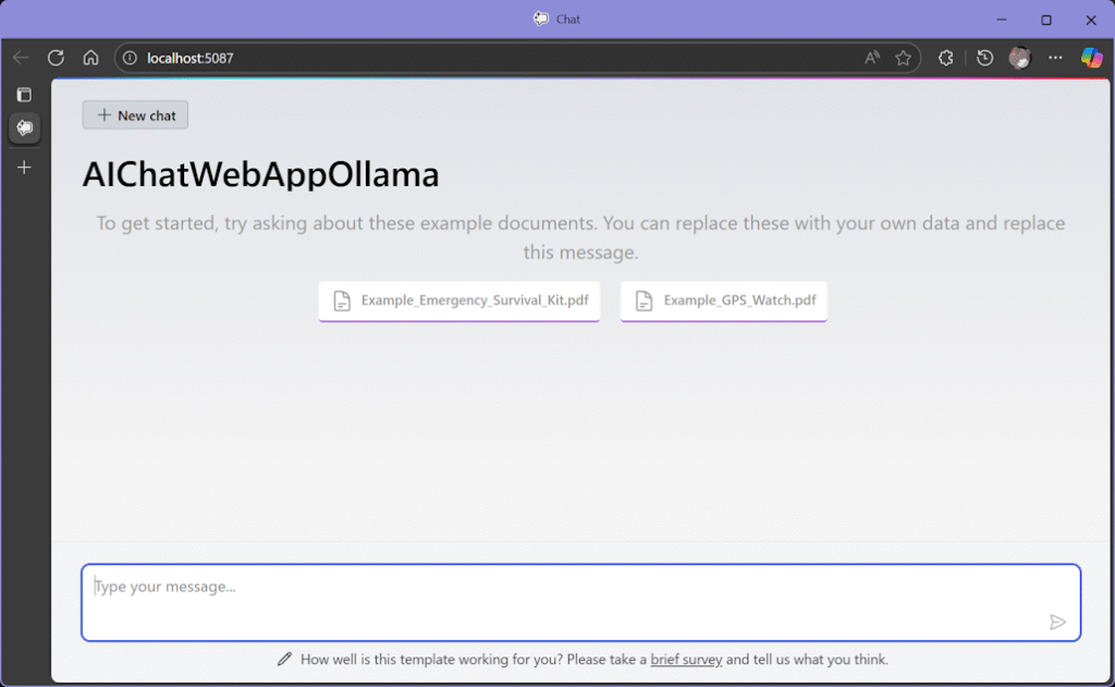 > dotnet new aichatweb --provider ollama --vector-store local --ChatModel llama3.2:latest --EmbeddingModel all-minilm:22m -o <プロジェクト名>